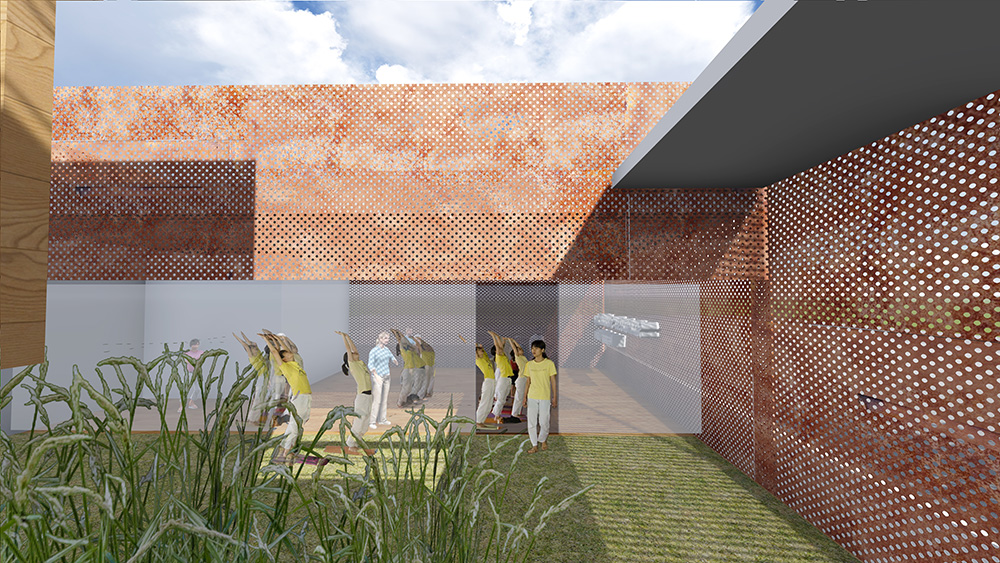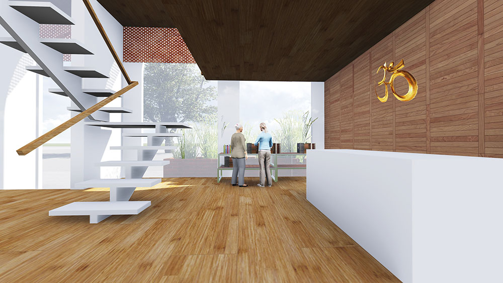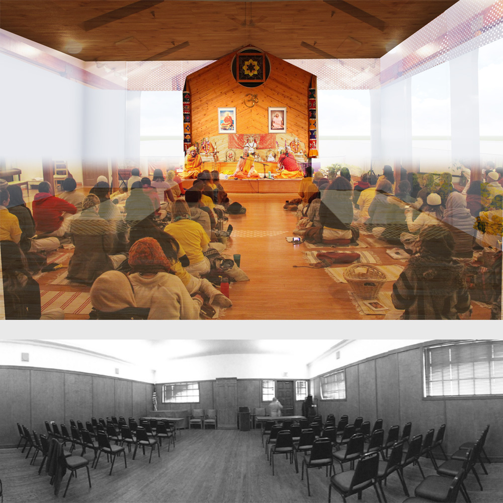 The 2000sf will double the existing building area to include a great hall, yoga studio, library, staff’s rooms and short-term resident apartments. The light filled double height lobby leads to an open courtyard on the upper level. The open space not only brings light and air the the surrounding rooms, but also serves as an extension of the adjacent yoga studio.